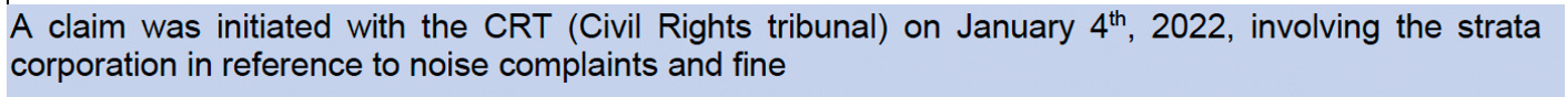 If you look at the monthly reports from February 2022 to June 2022, you will find this statement: “There are no legal suits or CRT actions involving the strata corporation.”